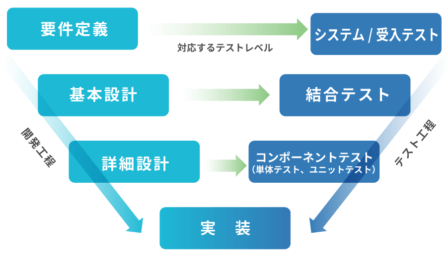 現在のソフトウェアやシステム開発では、アジャイル型開発モデルが頻繁に活用されますが、ウォーターフォール開発モデルは、システムの品質を重視する際や、大規模な開発に最適なシステム開発手法として頻繁に使用されています。また、最近では、V字型の図で解説されることが多いので、下記にその図を示します。