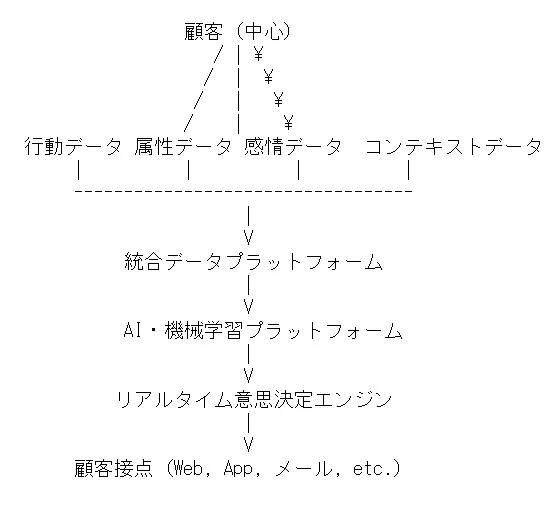 このモデルでは、まず顧客を中心に据え、その顧客に関するあらゆるデータを収集・統合します。行動データ、属性データ、感情データ、コンテキストデータといった主要なデータカテゴリーを網羅的に捉え、統合データプラットフォームに集約します。