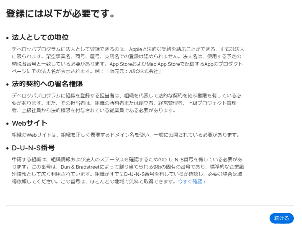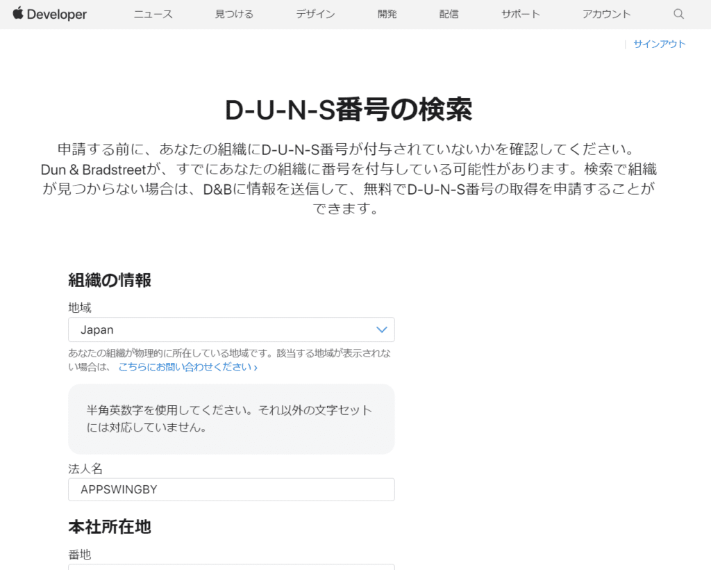 Apple Developer Program登録ページを下へスライドしていくとページの最後に「D-U-N-S番号」の入力を求められますで、事前に法人の「D-U-N-S番号」を調べておきます。